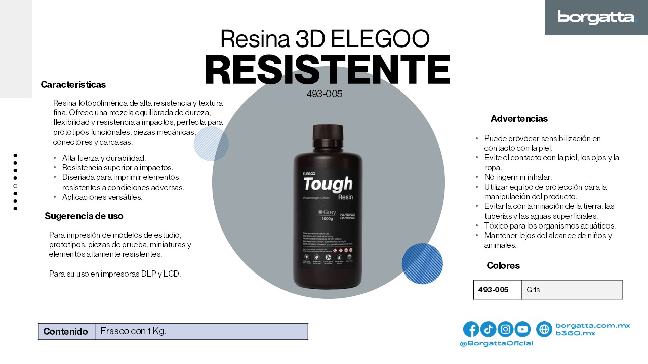 Resina fotopolimérica de alta resistencia y textura fina. Ofrece una mezcla equilibrada de dureza, flexibilidad y resistencia a impactos, perfecta para prototipos funcionales, piezas mecánicas, conectores y carcásas.